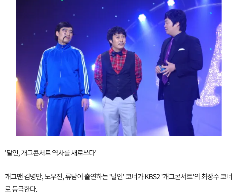 2007년 12월 9일, KBS2의 인기 코미디 쇼인 개그콘서트에서 ‘달인을 만나다’라는 제목으로 ‘달인’ 코너가 첫 방송되었다. 이후 이 코너는 ‘달인’이라는 이름으로 변경되어 2011년까지 약 4년간, 200편 이상의 에피소드를 방송하며 개그콘서트 사상 최장수 코너 중 하나가 되었다.